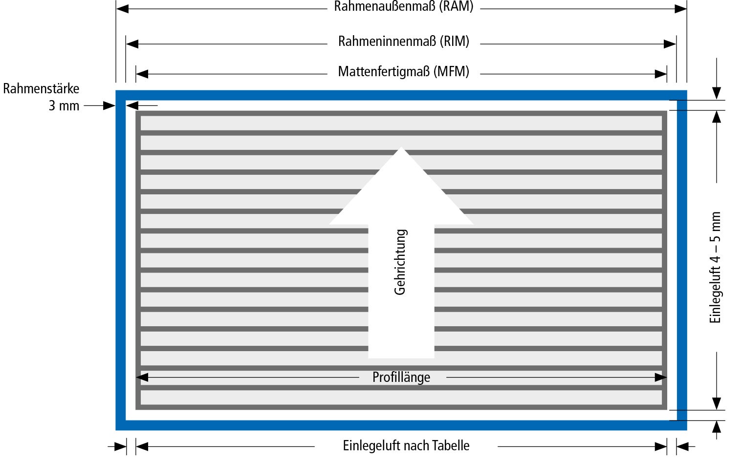 Umlaufend liegt die Standard-Einlegetoleranz unserer Eingangsmatten zwischen 2,0 und 2,5 mm. Somit werden von Rammeninnenmaß zum Mattenfertigmaß sowohl in der Stablänge als auch in der Gehrichtung insgesamt ca. 4 bis 5 mm abgezogen.