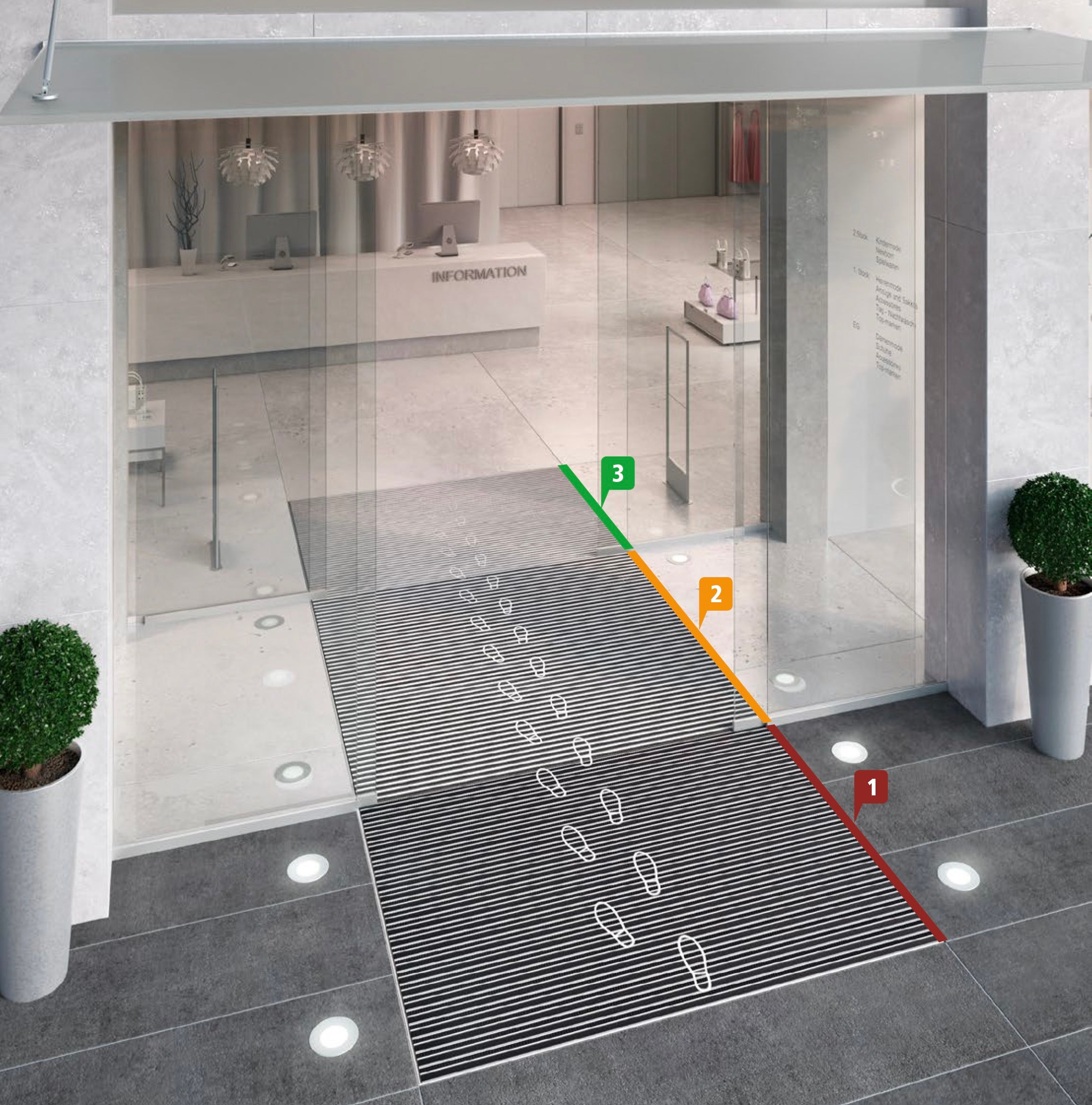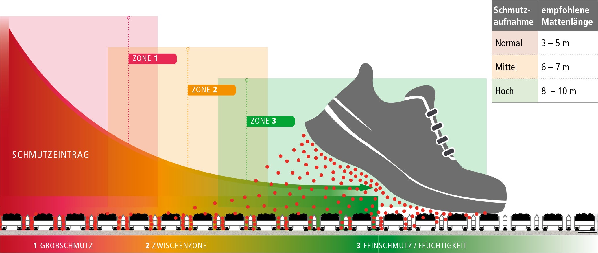 Für jeden Eingang mit hoher Begehungsfrequenz, wie öffentliche Gebäude oder Unternehmen, aber auch für Wohnungshäuser im Privatbereich, empfiehlt sich ein 3-Zonen System, um den Schmutz im inneren zu reduzieren. Mit einem geeignetem individuellem Eingangs-Matten-System werden Reinigungszeit als auch Reinigungskosten gespart und die Abnutzung der Bodenbeläge verringert.
