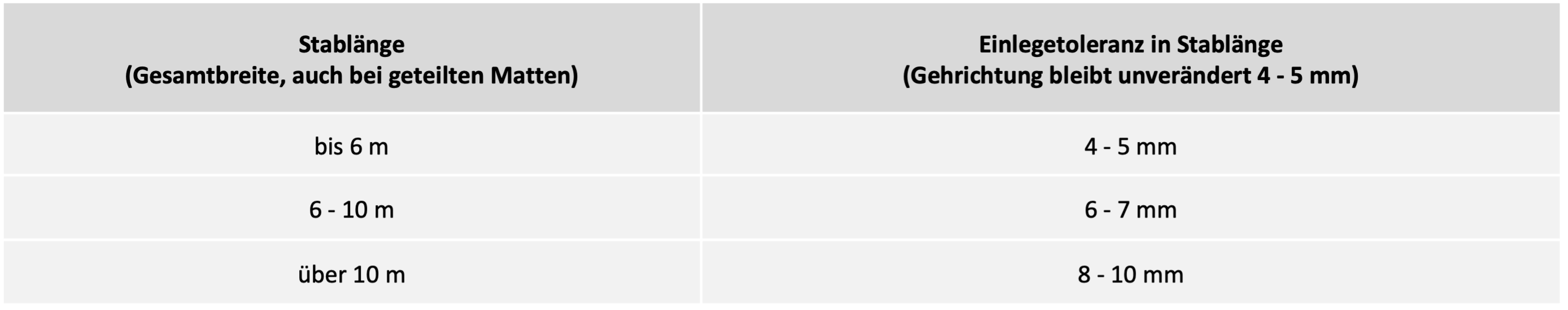 Daher empfehlen wir in folgender Tabelle eine Einlegetoleranz je nach Mattengröße: