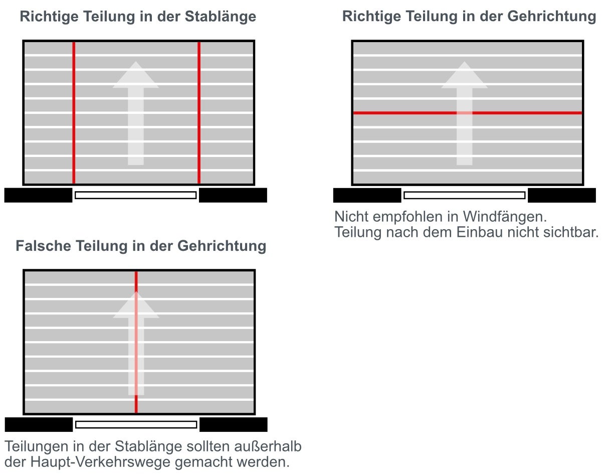 Ab einem Mittelgewicht von über 50 kg, sollten diese möglichst in Gehrichtung geteilt werden. Bei einer Profillänge über 300 cm muss die Teilung in Stablänge erfolgen, da sie sonst zum Einlegen und zur Pflege zu unhandlich bzw. zu schwer werden.