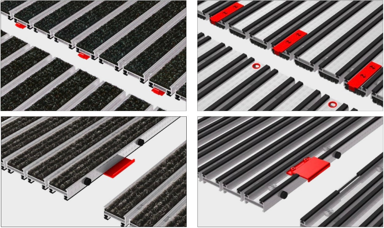 Bei mehrteiligen Eingangs-Matten-Systemen werden die einzelnen Mattensegmente durch Verbindungselemente aus VA2 miteinander verbunden. Das selbsterklärende Verbindungsprinzip ermöglicht eine einfache Montage und Demontage unserer Premium Eingangsmatten und verhindert zuverlässig ein Auseinanderdriften der Mittelteile.
